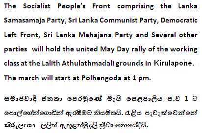 20th National Congress of the Communist Party of Sri Lanka will be held on 25th July 2014 to 27th July 2014 at the Samudri Hall, new town, Ratnapura. |